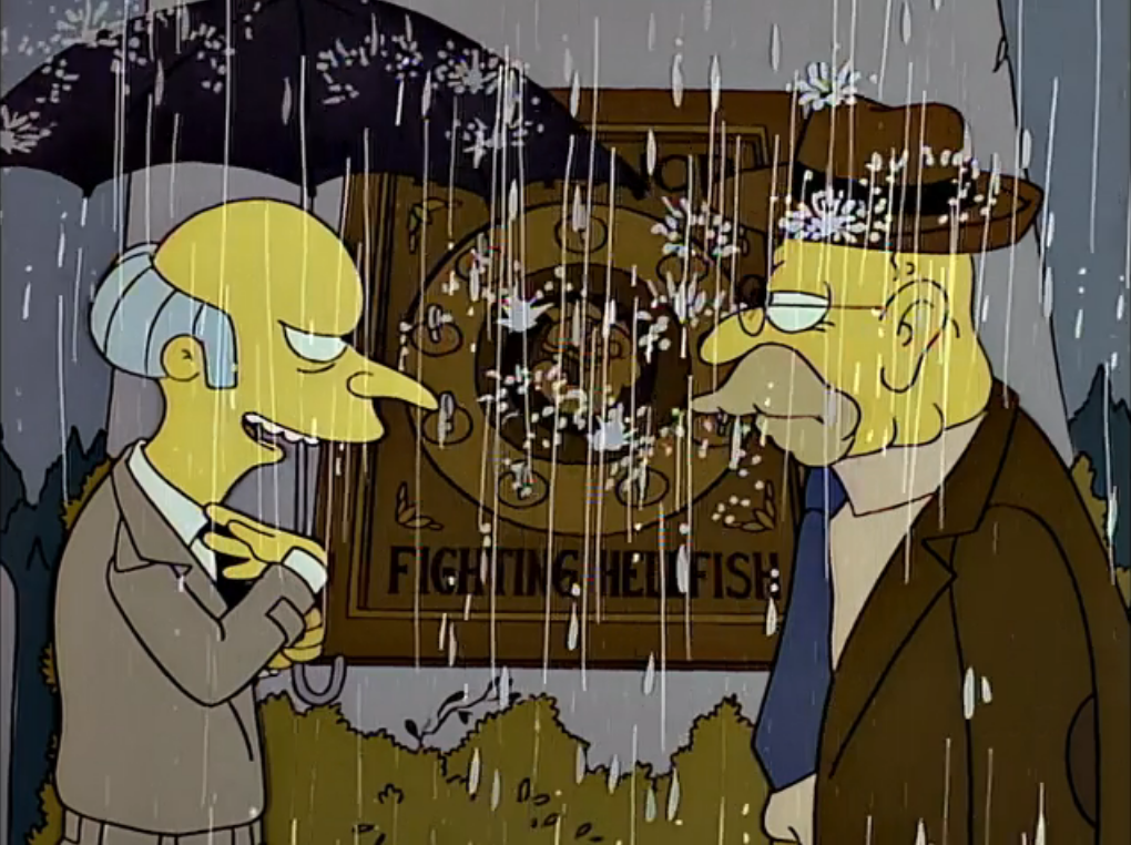 Fast forward back to 1996 where Grandpa and Bart retrieve the paintings from under the waters of Lake Springfield.  No sooner have they come up for air, the paintings are stolen by Mr. Burns. Grandpa Simpson catches up to Burnsy and “discharges” him from the Hellfish. Grandpa says this ouster also kicks Mr. Burns out of the Tontine, so Grandpa declares himself entitled to keep the paintings. His victory doesn’t last long. Soon U.S. government agents show up to return the paintings to the descendants of their rightful owner.